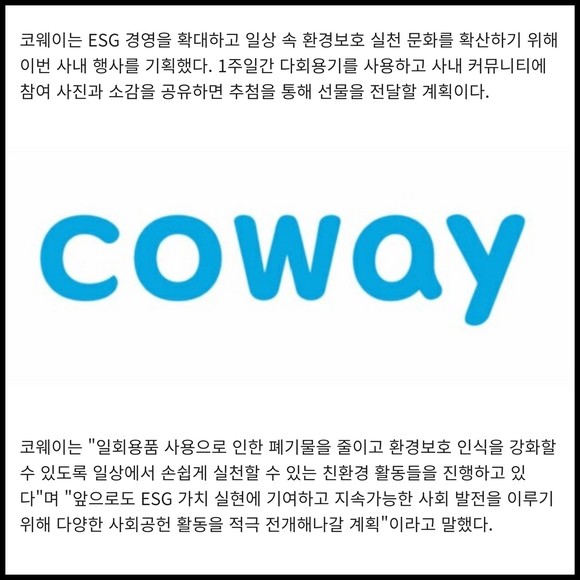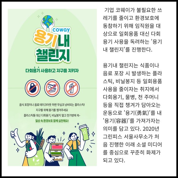 [카드] 코웨이, 환경캠페인 '용기내 챌린지' 진행