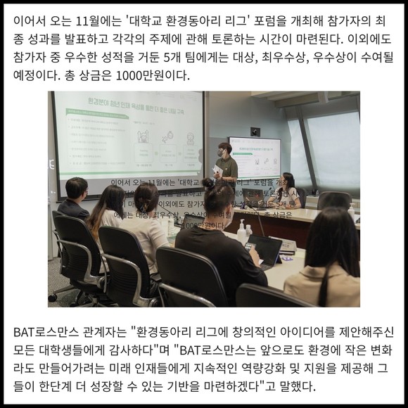 '대학교 환경동아리 리그'는 BAT로스만스가 진행하는 ESG 캠페인. 환경 분야 청년 인재를 육성하고 더 좋은 내일(A Better Tomorrow)을 만들기 위해 마련한 대학교 동아리 대항전이다. 지난 5월부터 전국 대학교 환경동아리를 대상으로 재활용과 업사이클링, 쓰레기와 폐기물 저감 등과 관련한 환경분야 아이디어를 공모했으며, 환경 분야 전문가 심사와 임직원 투표를 통해 총 10개 팀이 선정됐다.