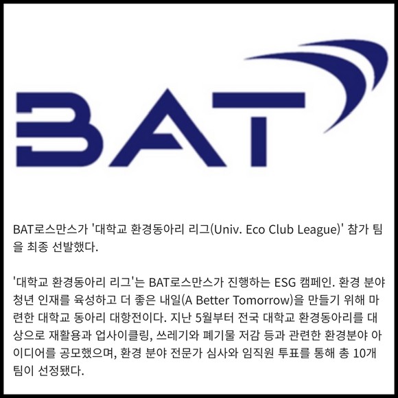 [프라임경제] BAT로스만스가 '대학교 환경동아리 리그(Univ. Eco Club League)' 참가 팀을 최종 선발했다.