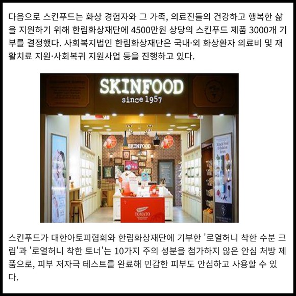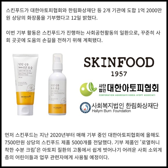 [프라임경제] 스킨푸드가 대한아토피협회와 한림화상재단 등 2개 기관에 도합 1억2000만원 상당의 화장품을 기부했다고 12일 밝혔다.