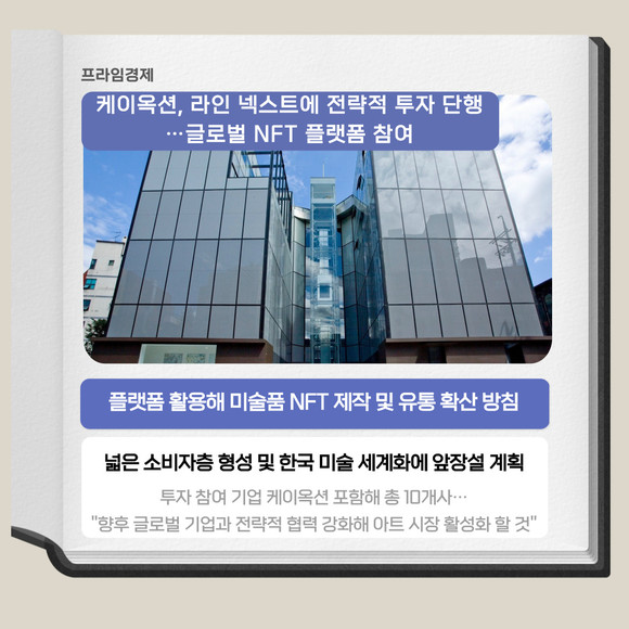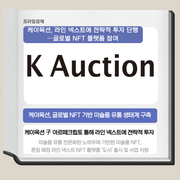 [프라임경제] 미술품 경매회사 케이옥션(102370)은 자회사인 아르떼크립토를 통해 라인 넥스트에 전략적 투자에 대한 본계약을 완료했다고 13일 밝혔다.