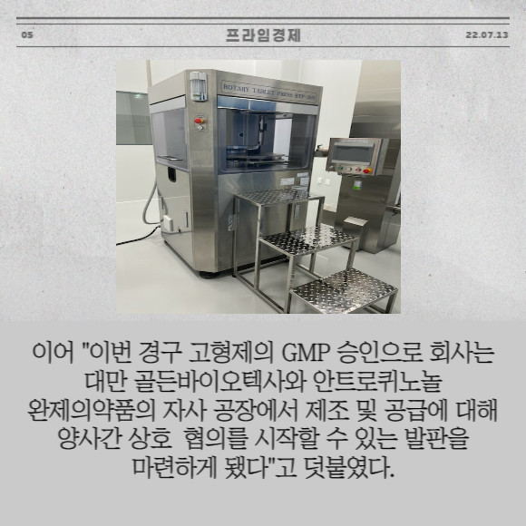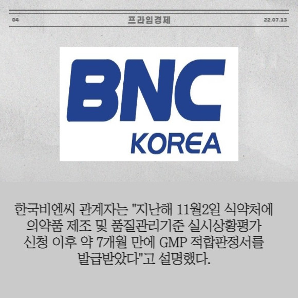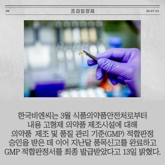[프라임경제] 한국비엔씨(256840)는 3월 식품의약품안전처로부터 내용 고형제 의약품 제조시설에 대해 의약품 제조 및 품질 관리 기준(GMP) 적합판정 승인을 받은 데 이어 지난달 품목신고를 완료하고 GMP 적합판정서를 최종 발급받았다고 13일 밝혔다.