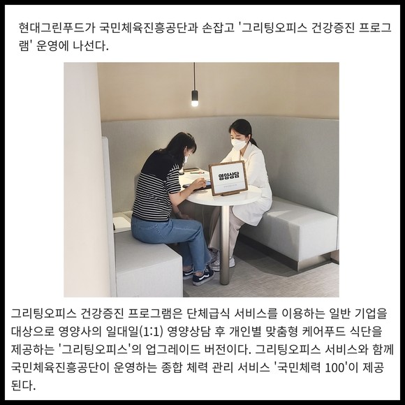 [프라임경제] 현대그린푸드가 국민체육진흥공단과 손잡고 '그리팅오피스 건강증진 프로그램' 운영에 나선다.