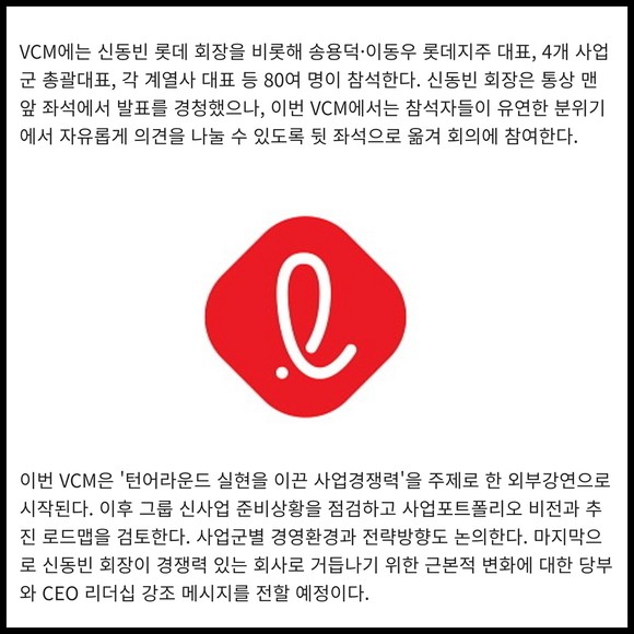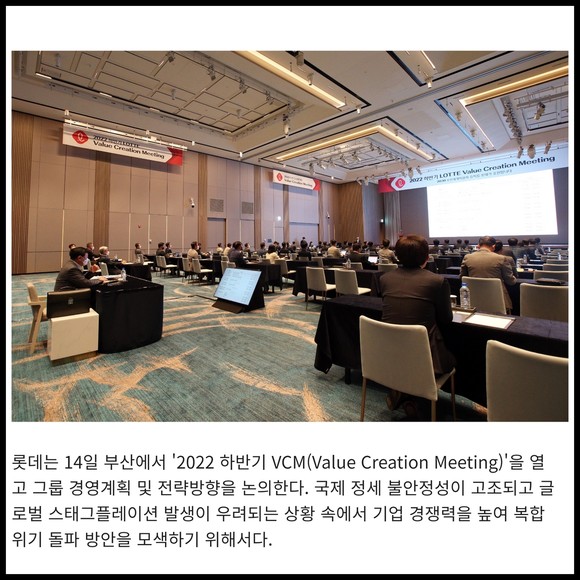 [프라임경제] 롯데는 14일 부산에서 '2022 하반기 VCM(Value Creation Meeting)'을 열고 그룹 경영계획 및 전략방향을 논의한다. 국제 정세 불안정성이 고조되고 글로벌 스태그플레이션 발생이 우려되는 상황 속에서 기업 경쟁력을 높여 복합 위기 돌파 방안을 모색하기 위해서다.