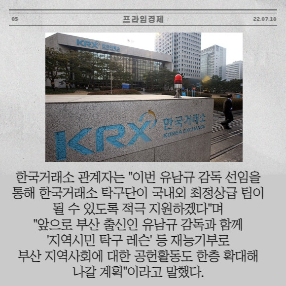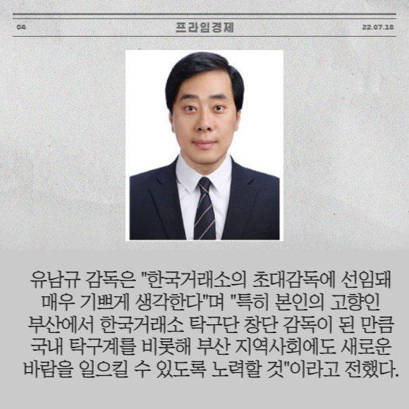 [프라임경제] 한국거래소는 올림픽 탁구 금메달리스트인 유남규 감독을 한국거래소 탁구단 창단 감독으로 선임했다고 18일 밝혔다.