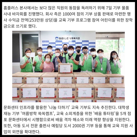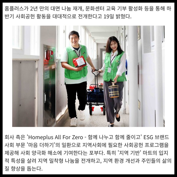 [프라임경제] 홈플러스가 2년 만의 대면 나눔 재개, 문화센터 교육 기부 활성화 등을 통해 하반기 사회공헌 활동을 대대적으로 전개한다고 19일 밝혔다.