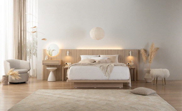 새 제품은 침실 한 쪽 벽을 아트월 디자인으로 구성해 별도의 공사 없이 호텔식 인테리어로 꾸밀 수 있는 게 특징이다. 침대 헤드보드에 은은한 조명과 템바보드(MDF를 반원이나 직각 형태로 가공해 이어붙인 것)를 포인트로 적용해 밋밋한 벽을 아트월로 연출하고, 모서리 부분에는 곡선형 패널을 추가해 마치 인테리어 공사를 한 것처럼 벽면을 자연스럽게 마감 할 수 있다고 회사 측은 설명했다.