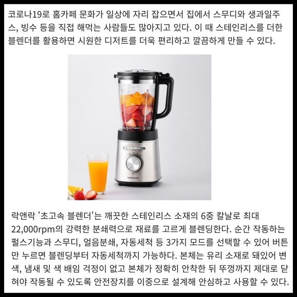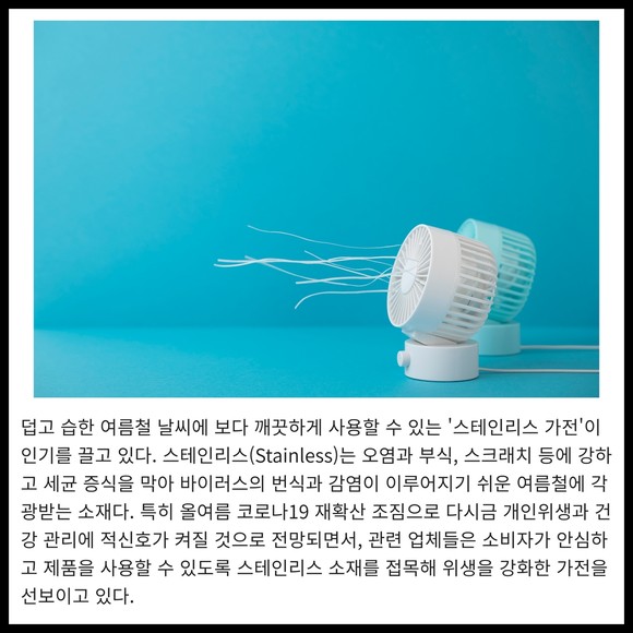 [프라임경제] 덥고 습한 여름철 날씨에 보다 깨끗하게 사용할 수 있는 '스테인리스 가전'이 인기를 끌고 있다. 스테인리스(Stainless)는 오염과 부식, 스크래치 등에 강하고 세균 증식을 막아 바이러스의 번식과 감염이 이루어지기 쉬운 여름철에 각광받는 소재다. 특히 올여름 코로나19 재확산 조짐으로 다시금 개인위생과 건강 관리에 적신호가 켜질 것으로 전망되면서, 관련 업체들은 소비자가 안심하고 제품을 사용할 수 있도록 스테인리스 소재를 접목해 위생을 강화한 가전을 선보이고 있다.