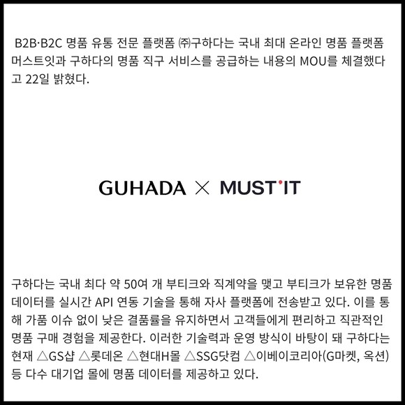 [프라임경제] B2B·B2C 명품 유통 전문 플랫폼 ㈜구하다(대표 윤재섭)는 국내 최대 온라인 명품 플랫폼 머스트잇과 구하다의 명품 직구 서비스를 공급하는 내용의 MOU를 체결했다고 22일 밝혔다.