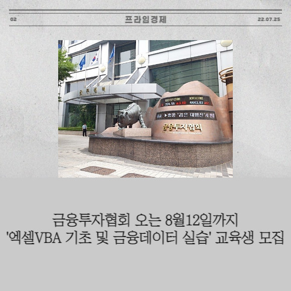 [프라임경제] 금융투자협회는 오는 8월12일까지 금융정보 활용 역량 강화를 위한 '엑셀VBA 기초 및 금융데이터 실습' 집합과정 교육생을 모집한다고 25일 밝혔다.