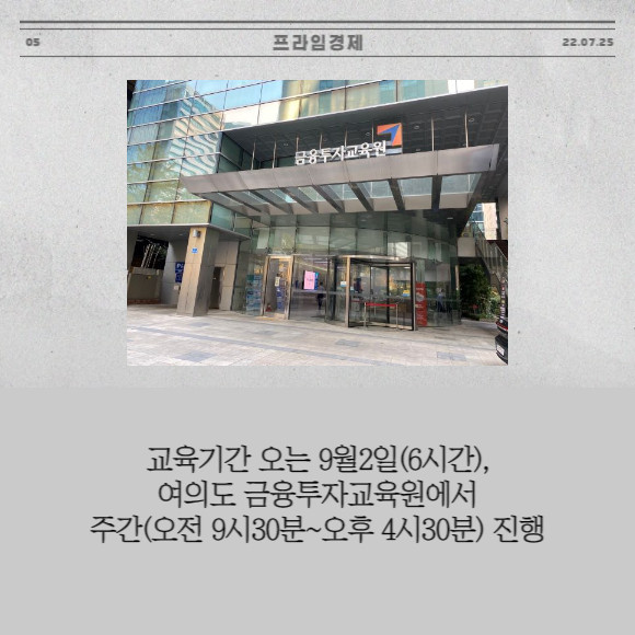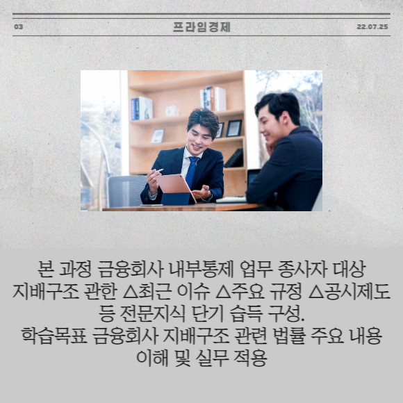 [프라임경제] 금융투자협회는 25일 '금융회사 지배구조법 해설' 집합과정 교육생을 오는 8월12일까지 모집한다고 밝혔다.