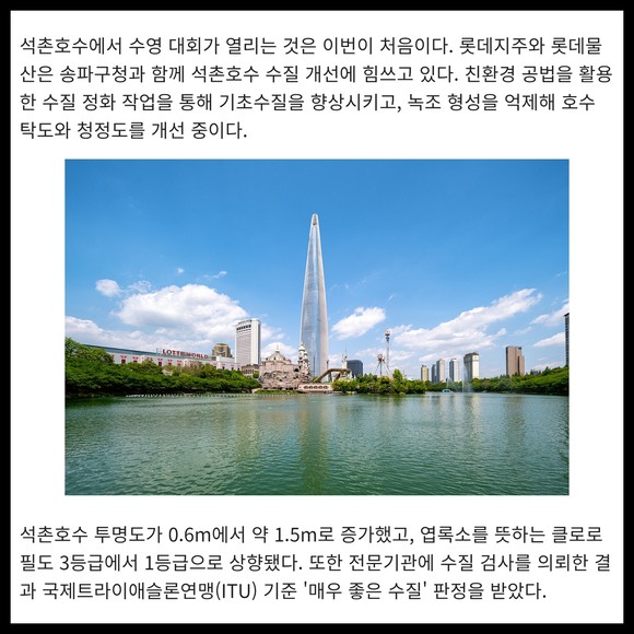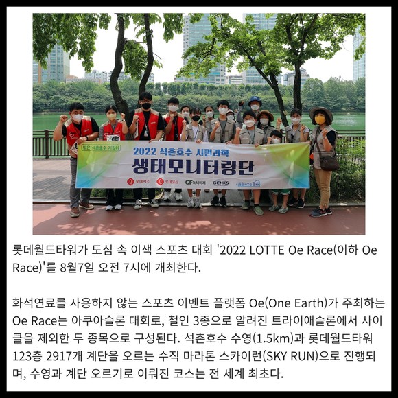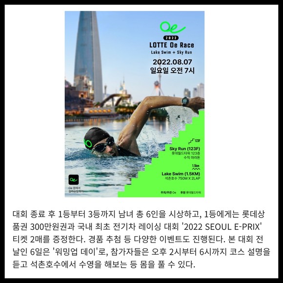 화석연료를 사용하지 않는 스포츠 이벤트 플랫폼 Oe(One Earth)가 주최하는 Oe Race는 아쿠아슬론 대회로, 철인 3종으로 알려진 트라이애슬론에서 사이클을 제외한 두 종목으로 구성된다. 석촌호수 수영(1.5km)과 롯데월드타워 123층 2917개 계단을 오르는 수직 마라톤 스카이런(SKY RUN)으로 진행되며, 수영과 계단 오르기로 이뤄진 코스는 전 세계 최초다.