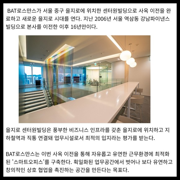 [프라임경제] BAT로스만스가 서울 중구 을지로에 위치한 센터원빌딩으로 사옥 이전을 완료하고 새로운 을지로 시대를 연다. 지난 2006년 서울 역삼동 강남파이낸스빌딩으로 본사를 이전한 이후 16년만이다.