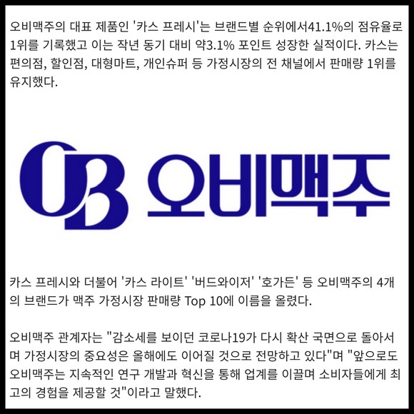 [카드] 오비맥주 카스, 상반기 맥주 가정시장 점유율 41.1%