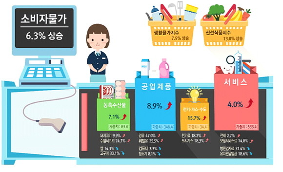 소비자물가 상승률은 작년 10월 3%대에 진입했고, 올해 3월(4.1%)과 4월(4.8%) 4%대를 기록했다. 이후 5월 5.4%, 6월 6.0% 순으로 지속 상승했다.