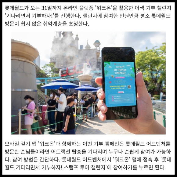 [프라임경제] 롯데월드가 오는 31일까지 온라인 플랫폼 '워크온'을 활용한 이색 기부 챌린지 '기다리면서 기부하자!'를 진행한다. 챌린지에 참여한 인원만큼 평소 롯데월드 방문이 쉽지 않은 취약계층을 초청한다.
