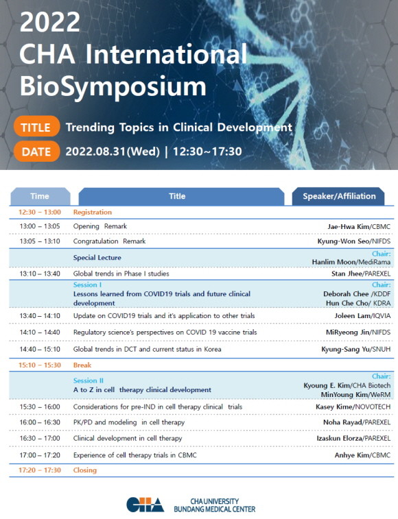 차 의과학대학교 분당차병원 글로벌 임상시험센터는 오는 31일 낮 12시30분부터 오후 5시30분까지 '2022 CHA 국제 바이오심포지엄'을 개최한다. 세계적인 임상시험 업체인 파락셀 Stan Jhee 박사, 서울대학교병원 유경상 교수를 비롯한 국내외 임상연구 전문가들이 연자로 참여해 임상 개발의 최신 동향과 다양한 첨단 기술을 이용한 임상연구 정보를 공유한다.