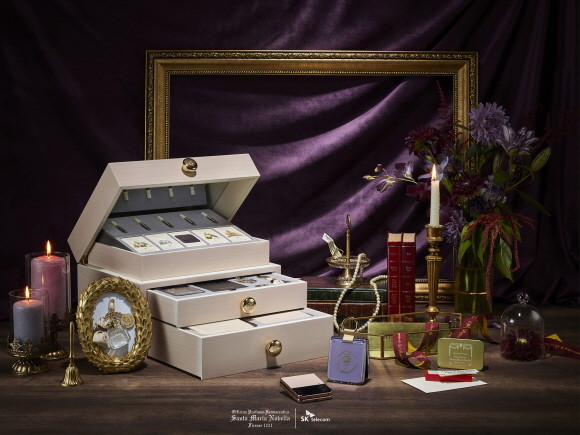 먼저 구성품이 담겨 있는 보관함은 산타마리아노벨라 로고 음각 장식과 브랜드를 상징하는 아이보리 색상의 나무 소재로 제작됐다. 3단으로 여닫을 수 있는 서랍에는 향수 용기 뚜껑에서 영감을 받은 골드 손잡이가 달려 있으며, 거울이 내장돼 있어 추후 화장대로도 활용 가능하다.