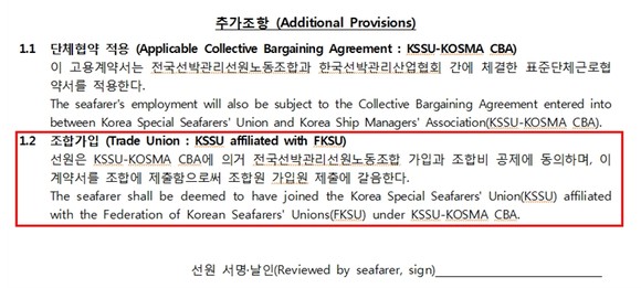 하지만 외국 선주의 배를 국내 해운사가 'BBC(나용선, 선박만 빌리고 선원은 선사에서 직접 채용) 방식'으로 운용하는 경우 이곳 해외취업선원들의 사정은 좀 다르다. 해운선사와 체결하는 근로계약서에는 특정 노조 단체명이 애초에 적시돼 있다. 계약서 추가 조항으로 '전국선박관리노동조합 가입 및 조합비 공제 동의'에 대한 취업 선원 본인이 '서명·날인'을 하게 돼 있다. 이렇게 작성된 계약서는 노사협의회 심사를 거친 끝에 최종적으로 취업이 결정된다.