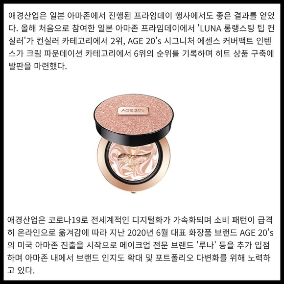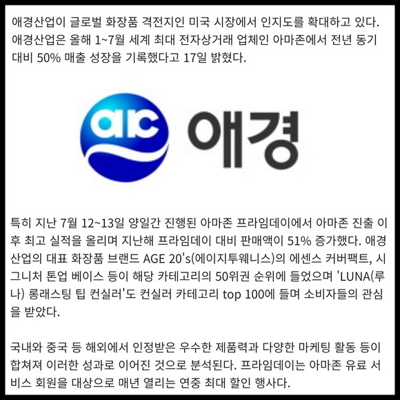 [프라임경제] 애경산업이 글로벌 화장품 격전지인 미국 시장에서 인지도를 확대하고 있다. 애경산업은 올해 1~7월 세계 최대 전자상거래 업체인 아마존에서 전년 동기 대비 50% 매출 성장을 기록했다고 17일 밝혔다.