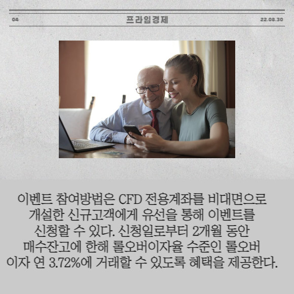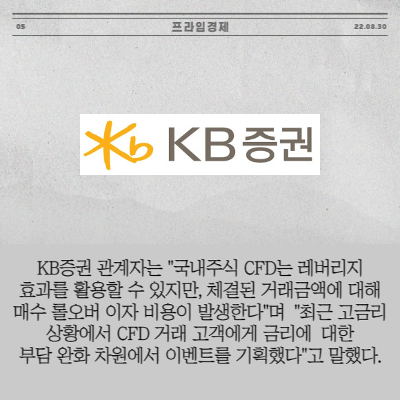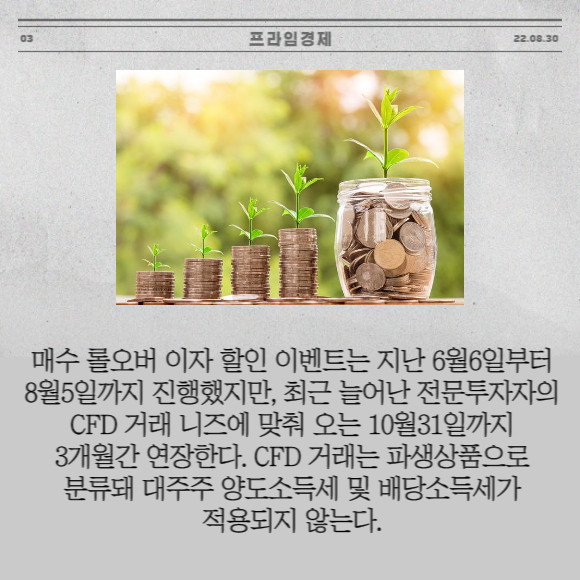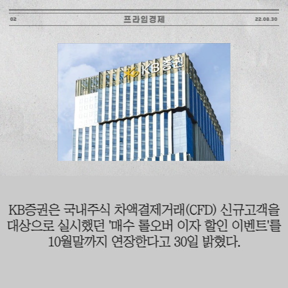 [프라임경제] KB증권은 국내주식 차액결제거래(CFD) 신규고객을 대상으로 실시했던 '매수 롤오버 이자 할인 이벤트'를 10월말까지 연장한다고 30일 밝혔다.