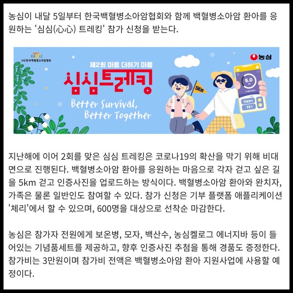 [카드] 농심, 백혈병 환아 지원 '심심 트레킹' 참가 모집