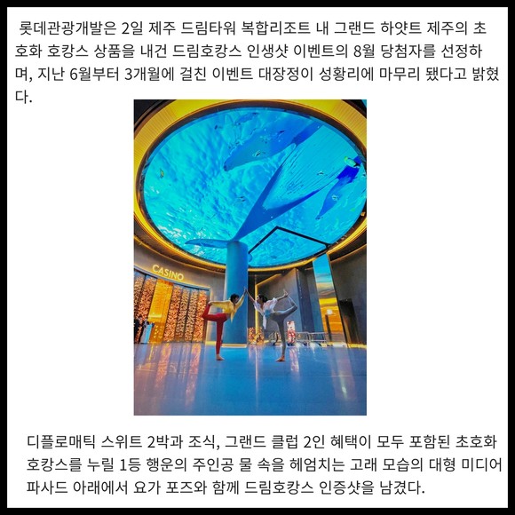 [프라임경제] 롯데관광개발은 2일 제주 드림타워 복합리조트 내 그랜드 하얏트 제주의 초호화 호캉스 상품을 내건 드림호캉스 인생샷 이벤트의 8월 당첨자를 선정하며, 지난 6월부터 3개월에 걸친 이벤트 대장정이 성황리에 마무리 됐다고 밝혔다.