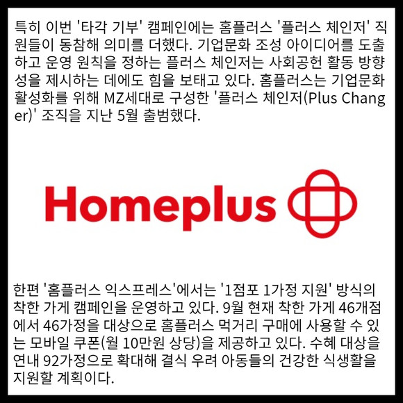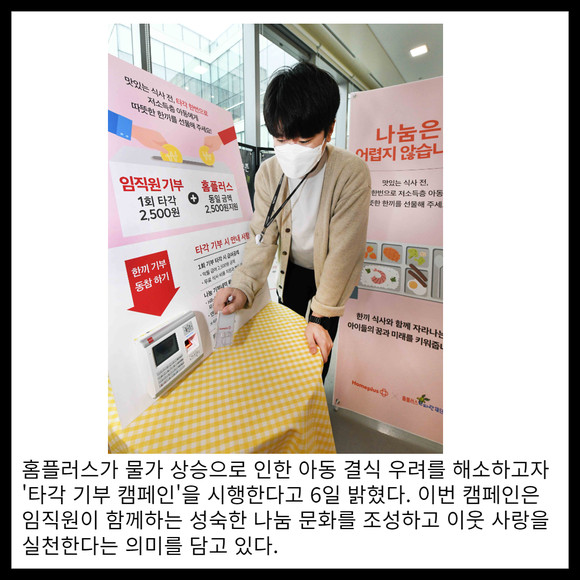 [프라임경제] 홈플러스가 물가 상승으로 인한 아동 결식 우려를 해소하고자 '타각 기부 캠페인'을 시행한다고 6일 밝혔다. 이번 캠페인은 임직원이 함께하는 성숙한 나눔 문화를 조성하고 이웃 사랑을 실천한다는 의미를 담고 있다.