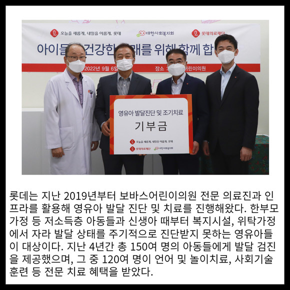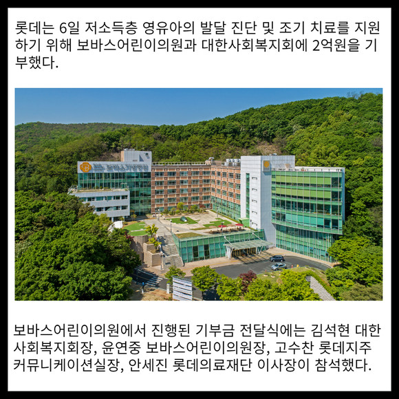 [프라임경제] 롯데는 6일 저소득층 영유아의 발달 진단 및 조기 치료를 지원하기 위해 보바스어린이의원과 대한사회복지회에 2억원을 기부했다.