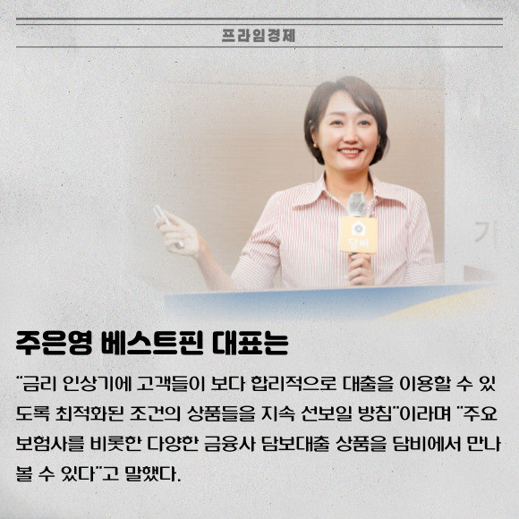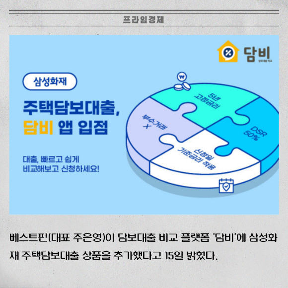 [프라임경제] 베스트핀(대표 주은영)이 담보대출 비교 플랫폼 '담비'에 삼성화재 주택담보대출 상품을 추가했다고 15일 밝혔다.