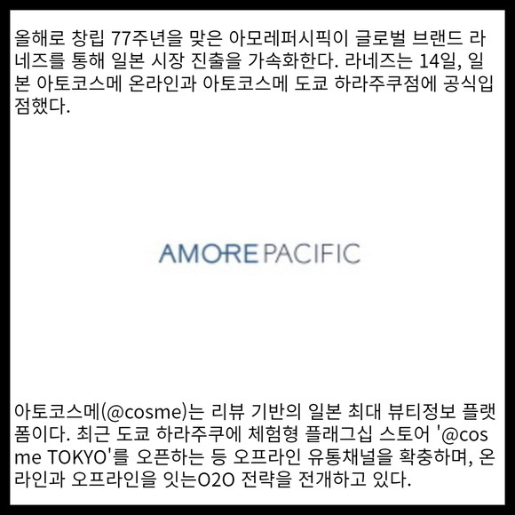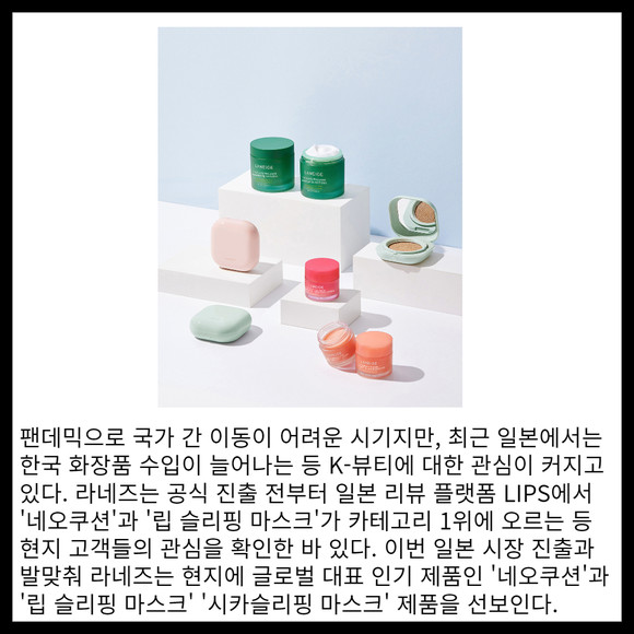 [프라임경제] 아모레퍼시픽이 글로벌 브랜드 라네즈를 통해 일본 시장 진출을 가속화한다. 라네즈는 14일(수요일), 일본 아토코스메 온라인과 아토코스메 도쿄 하라주쿠점에 공식입점했다.