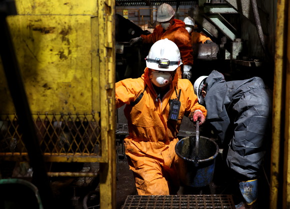 최정우 포스코그룹 회장(오른쪽 첫 번째)이 지난 17일 침수피해를 크게 입은 포항제철소 압연지역(후판공장) 지하에서 직원들과 함께 토사 제거 작업을 하고 있다. ⓒ 포스코