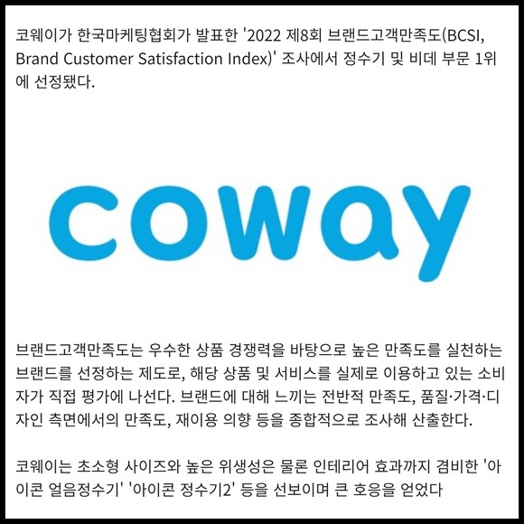 [카드] 코웨이 '2022 브랜드고객만족도' 정수기·비데 부문 1위