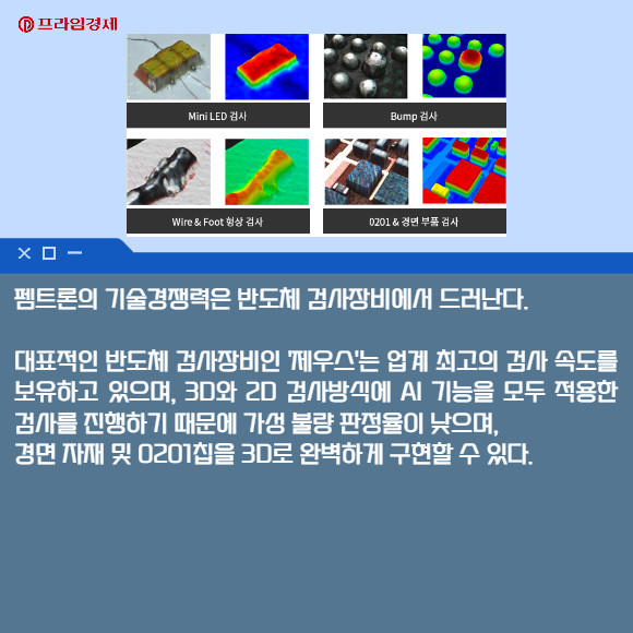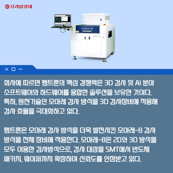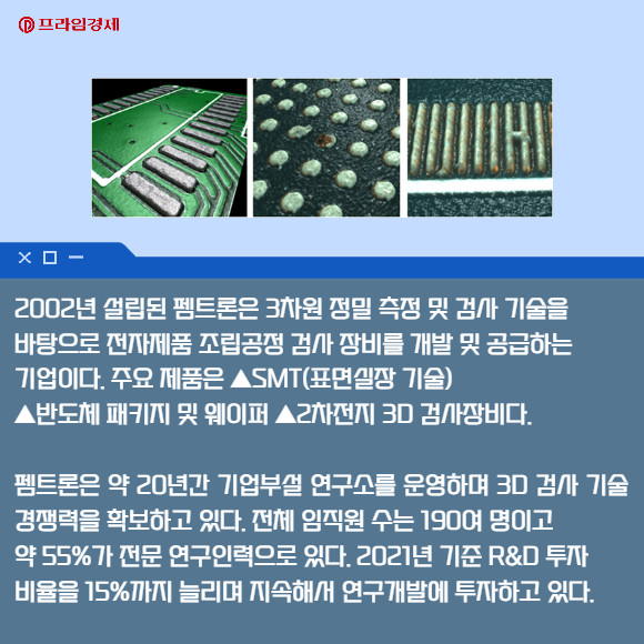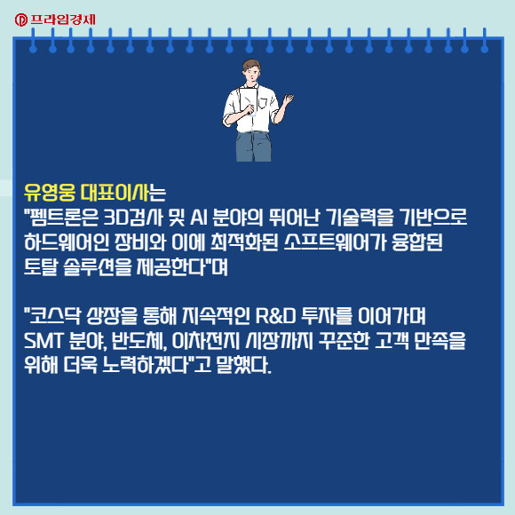 유영웅 대표이사는 "펨트론은 3D검사 및 AI 분야의 뛰어난 기술력을 기반으로 하드웨어인 장비와 이에 최적화된 소프트웨어가 융합된 토탈 솔루션을 제공한다"며 "코스닥 상장을 통해 지속적인 R&D 투자를 이어가며 SMT 분야, 반도체, 이차전지 시장까지 꾸준한 고객 만족을 위해 더욱 노력하겠다"고 말했다.