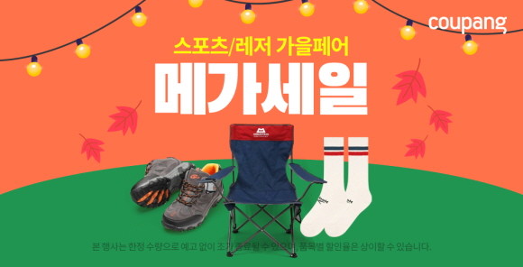 쿠팡이 운동하기 좋은 가을을 맞이해 '스포츠/레저 가을페어 메가세일'을 오는 10월9일까지 진행한다.