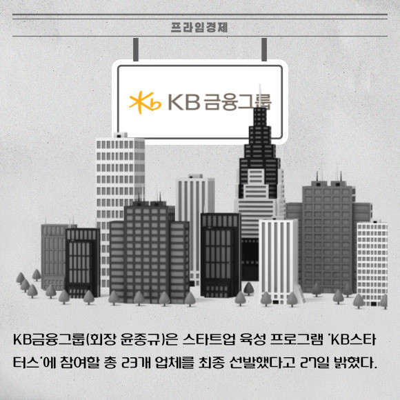 [프라임경제] KB금융그룹(회장 윤종규)은 스타트업 육성 프로그램 'KB스타터스'에 참여할 총 23개 업체를 최종 선발했다고 27일 밝혔다.