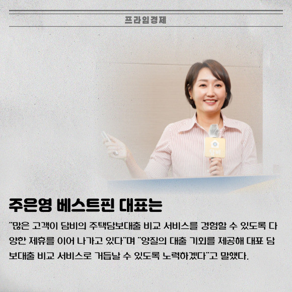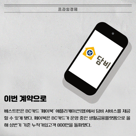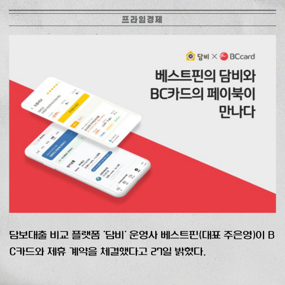 [프라임경제] 담보대출 비교 플랫폼 '담비' 운영사 베스트핀(대표 주은영)이 BC카드와 제휴 계약을 체결했다고 27일 밝혔다.