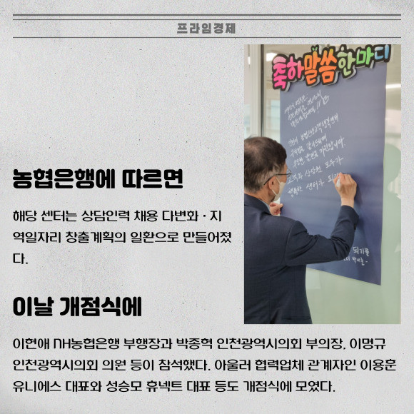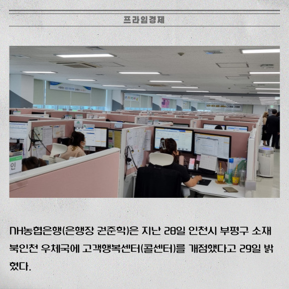 [프라임경제] NH농협은행(은행장 권준학)은 지난 28일 인천시 부평구 소재 북인천 우체국에 고객행복센터(콜센터)를 개점했다고 29일 밝혔다.