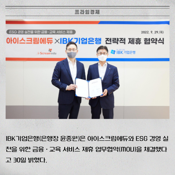 [프라임경제] IBK기업은행(은행장 윤종원)은 아이스크림에듀와 ESG 경영 실천을 위한 금융·교육 서비스 업무협약(MOU)을 체결했다고 30일 밝혔다.