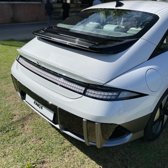 옆에서 바라본 아이오닉 6는 당장이라도 공기를 가르며 미끄러지듯 달릴 듯한 강렬한 인상을 풍겨낸다. 필자는 마이크로소프트의 블루투스 마우스를 사용하고 있는데, 그것과 비슷하게 생겼다. 여기에 입체적으로 생긴 후면의 경우 투명 재질의 리어 스포일러와 가로로 길게 뻗은 LED 리어 콤비 램프가 미래지향적인 동시에 도로 위에서 아이오닉 6의 존재감을 배가시킨다.