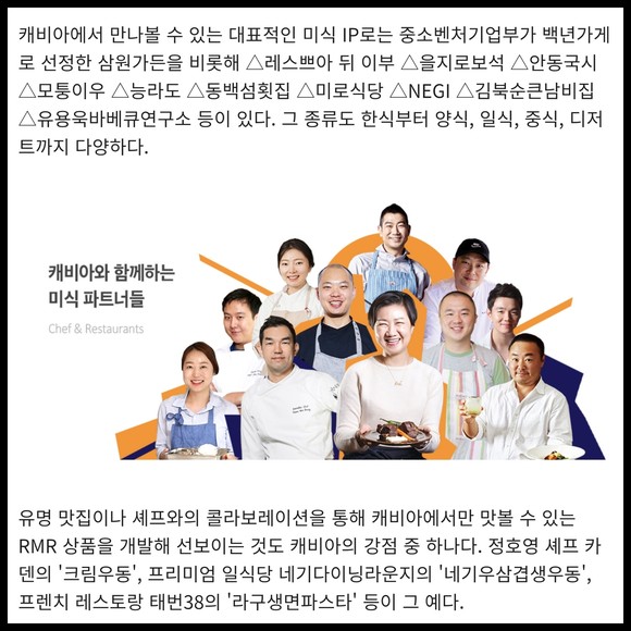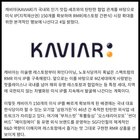 [프라임경제] 캐비아(KAVIAR)가 국내외 인기 맛집·셰프와의 탄탄한 협업 관계를 바탕으로 미식 IP(지적재산권) 150개를 확보하며 RMR(레스토랑 간편식) 시장 확대를 위한 본격적인 행보에 나선다고 4일 밝혔다.