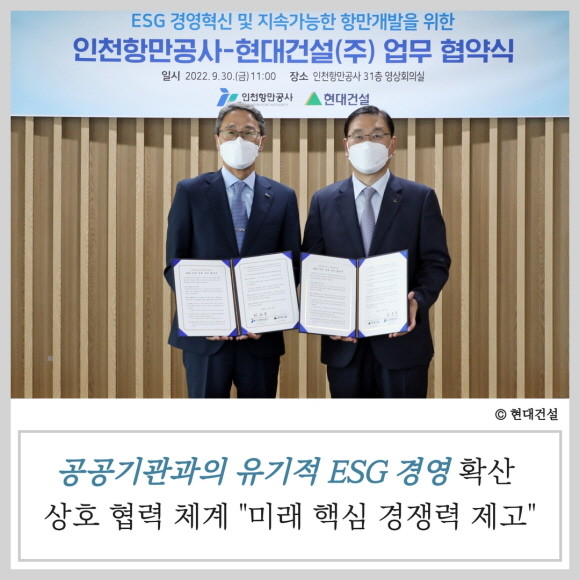 현대건설(000720)이 지속가능한 사회와 환경 조성을 위해 인천항만공사(이하 IPA)와 협업해 ESG경영에 박차를 가한다.