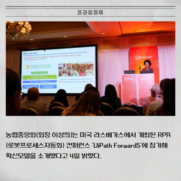 [프라임경제] 농협중앙회(회장 이성희)는 미국 라스베가스에서 개최된 RPA(로봇프로세스자동화) 컨퍼런스 'UiPath Forward5'에 참가해 확산모델을 소개했다고 4일 밝혔다.