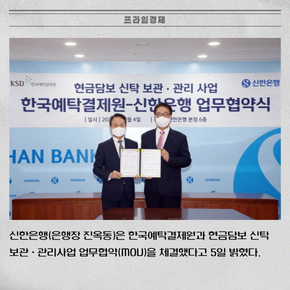 [프라임경제] 신한은행(은행장 진옥동)은 한국예탁결제원과 현금담보 신탁 보관·관리사업 업무협약(MOU)을 체결했다고 5일 밝혔다.