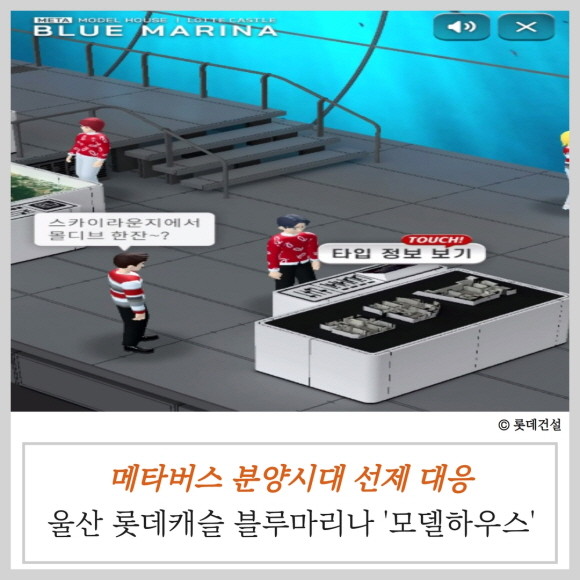 롯데건설이 '프롭테크 기업' 직방과의 협업을 통해 울산 롯데캐슬 블루마리나 생활숙박시설 분양에 메타버스 모델하우스를 런칭했다. 이는 향후 다가올 메타버스 분양 시대를 선제 대응하기 위한 목적이다.
