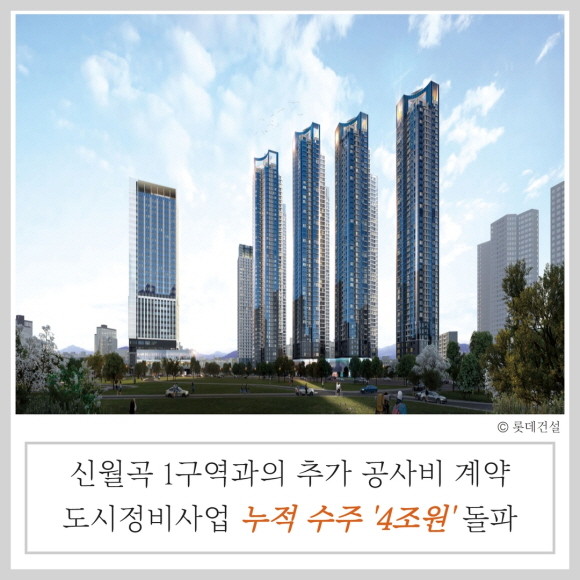 롯데건설이 지난 13일 신월곡1구역 도시 환경 정비사업조합과 추가 공사비 3174억원에 대한 계약을 체결하면서 도시정비사업 누적 수주액 4조 원을 돌파했다.