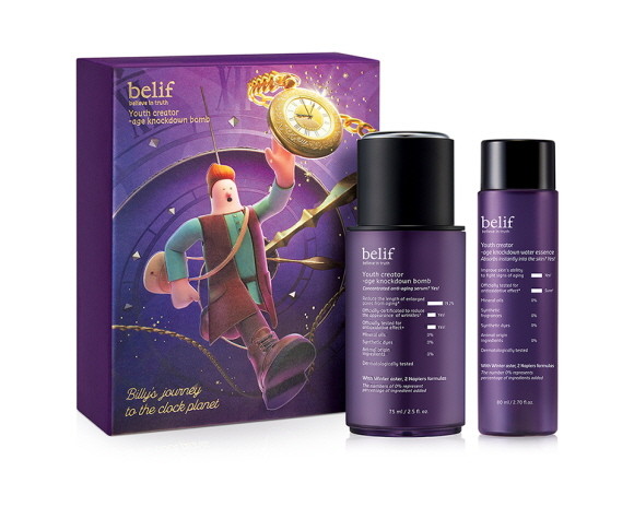 또한 시간과 중력을 거스르는 안티에이징 제품의 특성을 빌리프만의 재치 넘치는 일러스트로 패키지 디자인에 녹여내 소장가치를 더했다. 빌리프 세계관 속 주인공 '빌리'가 영험한 힘이 담긴 자수정을 찾아 clock planet으로 향하는 모험의 한 장면을 담았다.