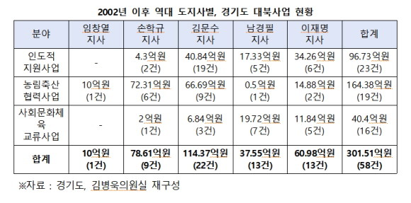 김 의원이 경기도로부터 받은 2002년 이후 역대 경기도지사 대북사업 투자 현황에 따르면 △임창열 지사 10억원 △손학규 지사 78억6100만원 △김문수 지사 114억3700만원 △남경필 지사 37억5500만원 △이재명 지사 60억9800만원이다.