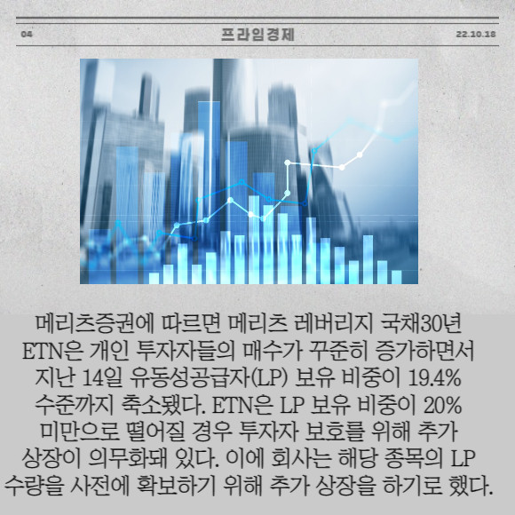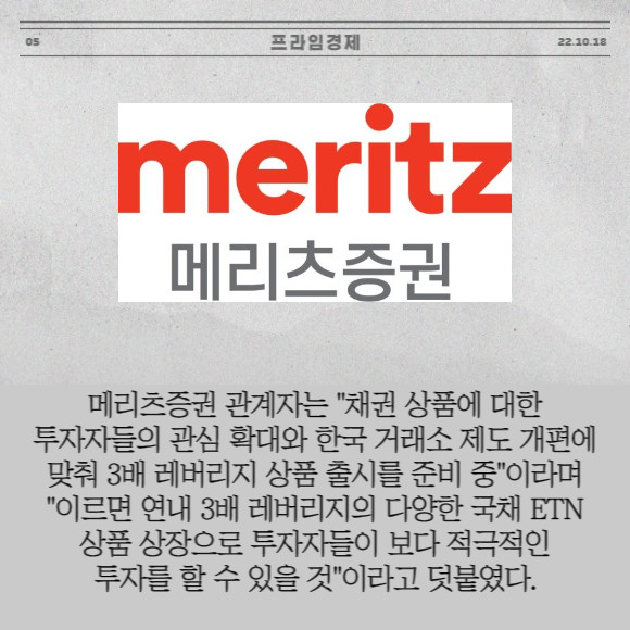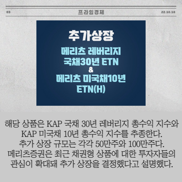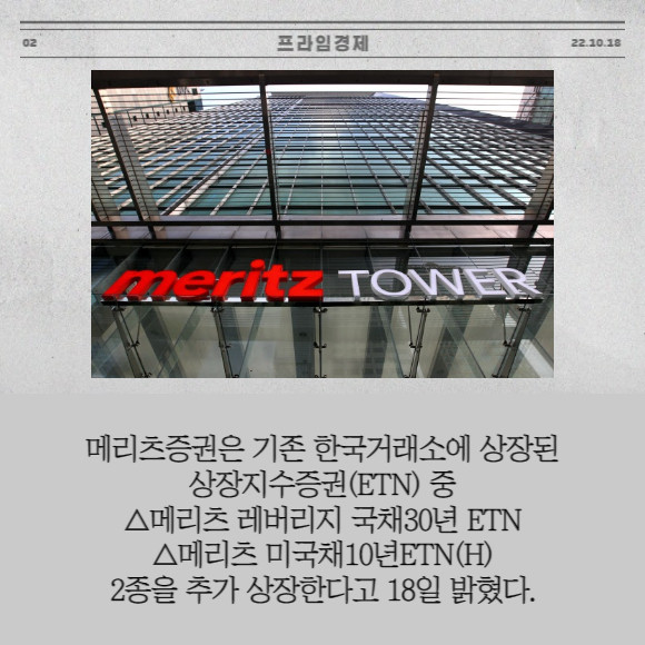 [프라임경제] 메리츠증권(008560)은 기존 한국거래소에 상장된 상장지수증권(ETN) 중 △메리츠 레버리지 국채30년 ETN △메리츠 미국채10년ETN(H) 2종을 추가 상장한다고 18일 밝혔다.