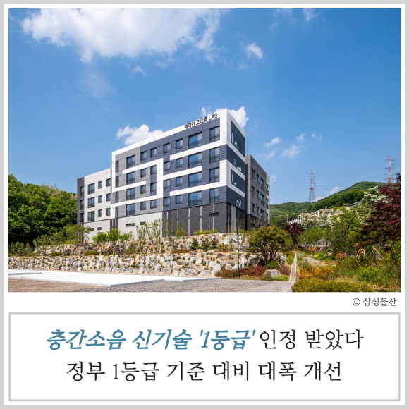삼성물산이 고중량 바닥패널과 스프링을 활용한 층간소음 차단 신기술로 1등급 성능을 공식 인정받았다. 층간소음 저감 신기술로 국가공인기관이 실시하는 바닥충격음 차단 성능등급 평가에서 경량충격음은 물론, 중량충격음 모두 1등급 인정서를 취득한 것이다.
